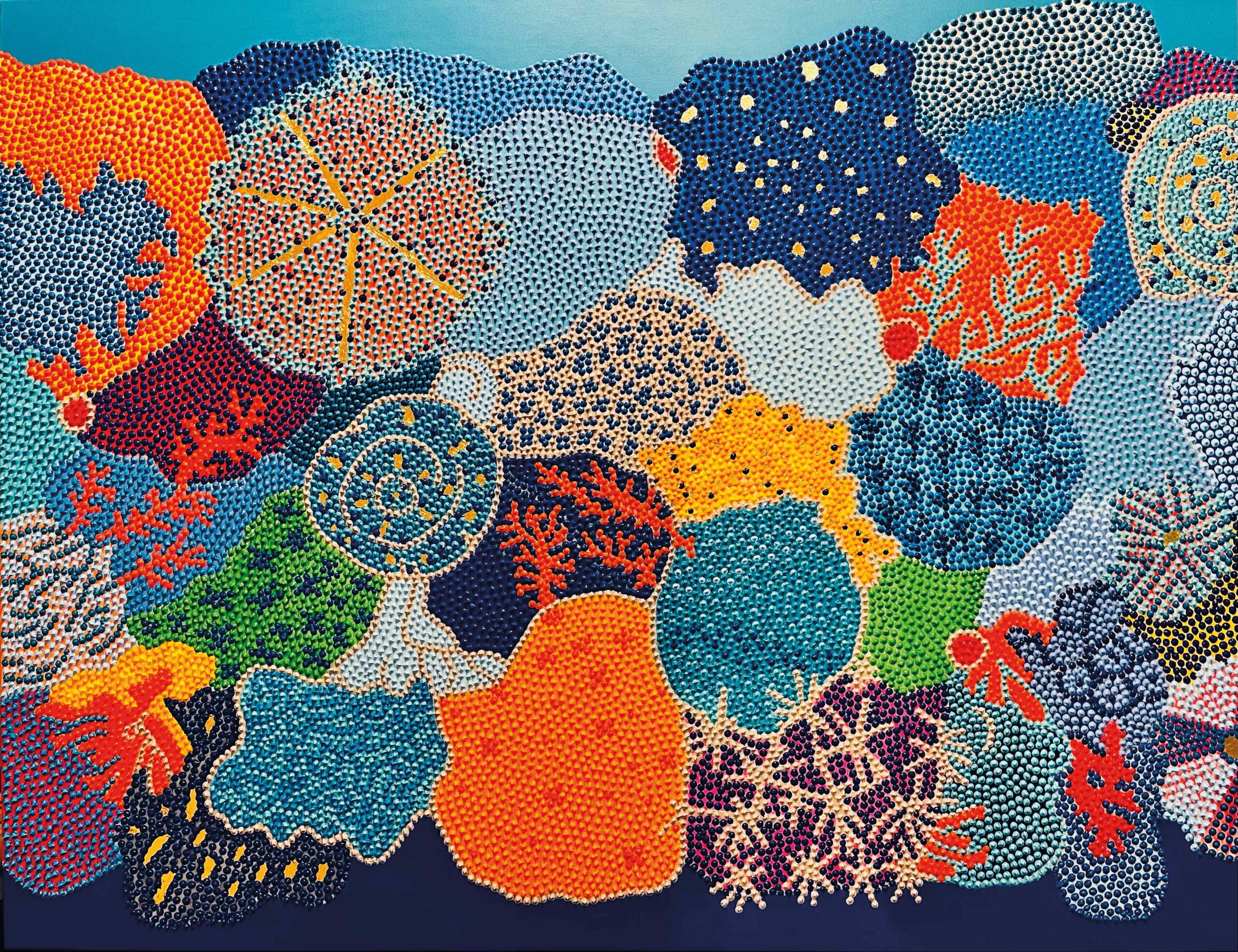 The experience with aboriginal artists inspired Laure to develop a new technique she named «peaks of colour», that gave her work a «3D» effect. These «peaks of colour» carefully placed one-by-one on the canvas, bestow the time dimension and precision necessary for each bespoke painting. The «peak» is the element that allows this emotional reconnection of humanity with the natural world and its deep animal nature. The «peak» also questions the spectator regarding her/ his identity and individuality: Am I one if there are multitudes in me? Am I only one peak amongst so many others?
